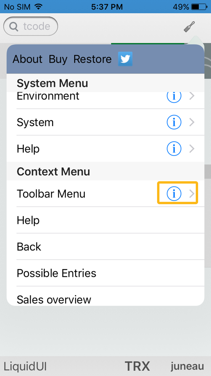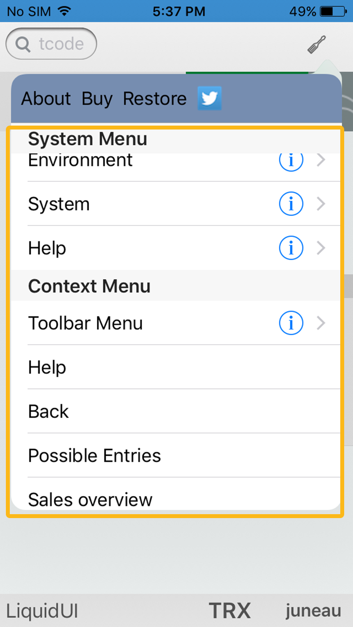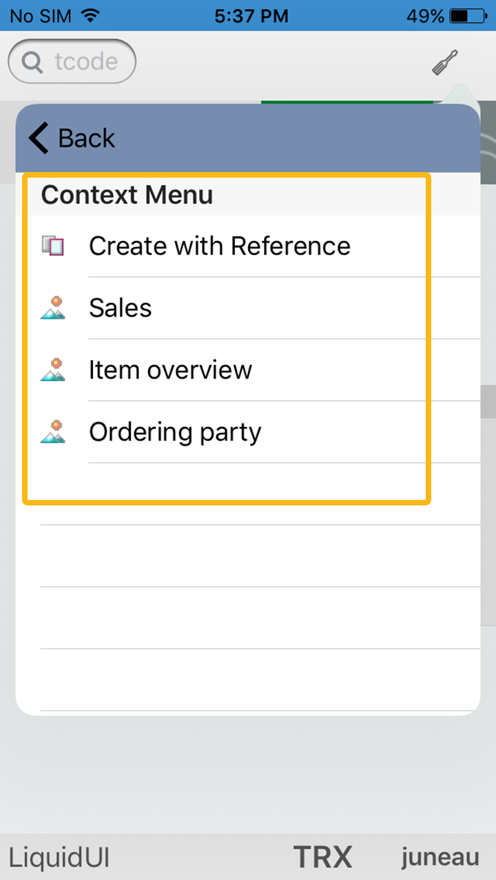 - Corresponds to the options that are accessed from the context menu when you right-click in SAPGUI. However, all context menu options are listed in Liquid UI, unlike SAPGUI where the menu options will change depending on the screen.