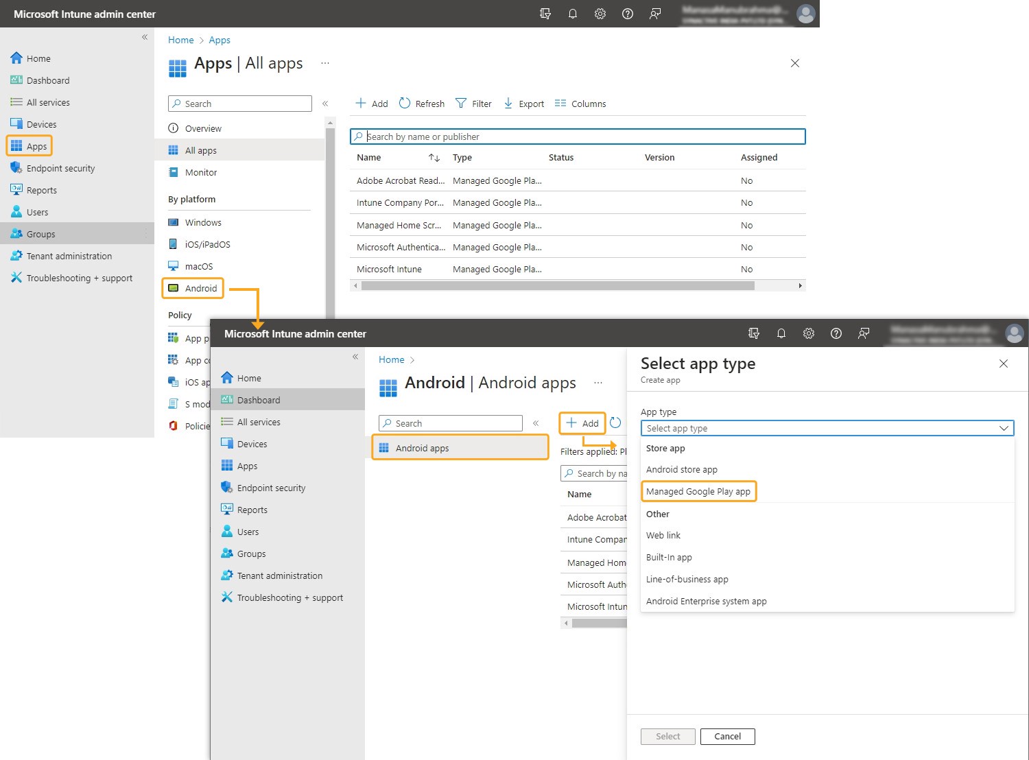 - Click on the Apps icon under Dashboard to navigate to the Apps window. Select Android under the By Platform category, and choose Managed Google Play App from the list of available app types by clicking on Add.