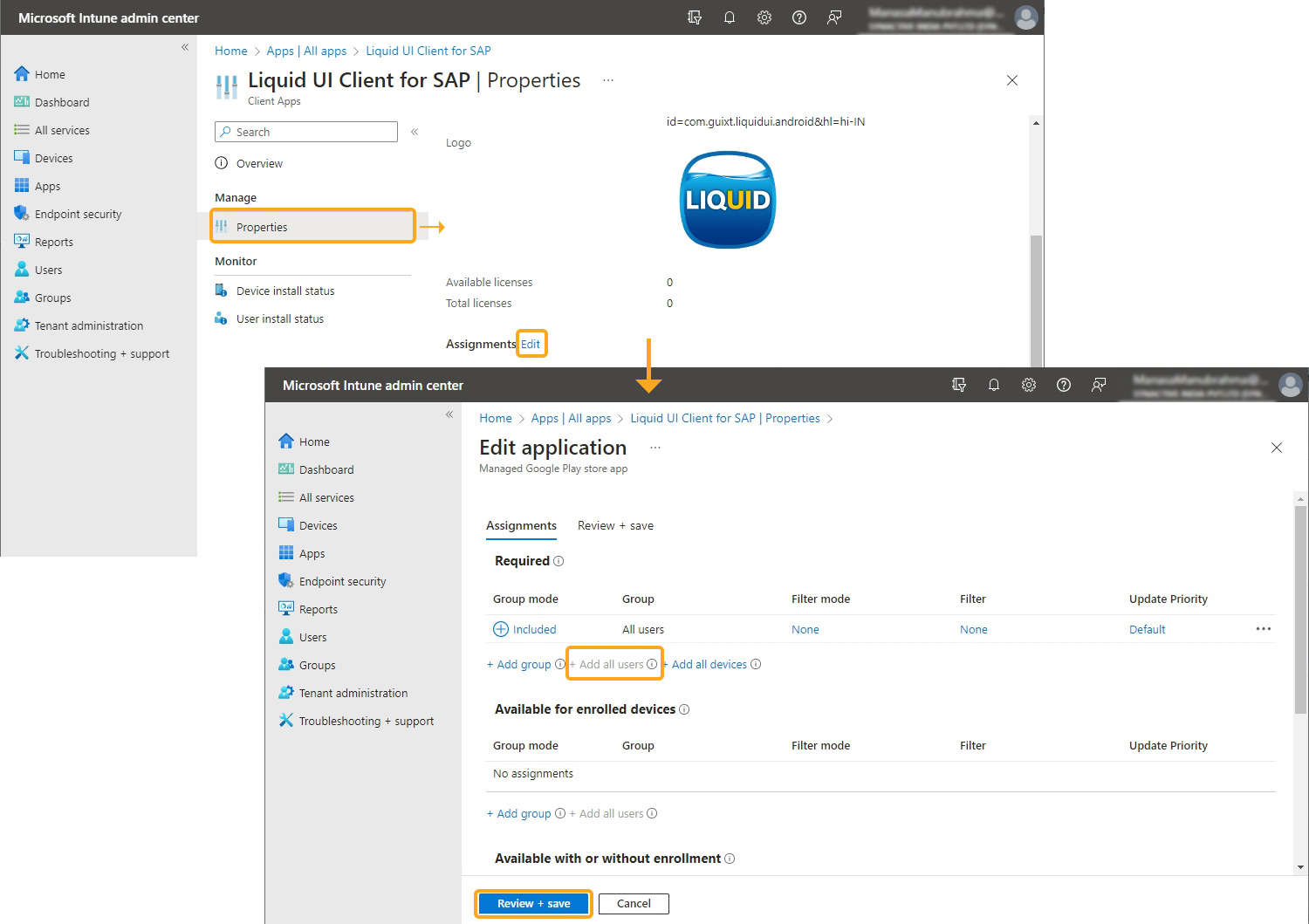 - Go to Apps->All Apps, select the Liquid UI app, and then click on Properties. Now click on Assignments Edit to add users to the application. On the Edit application window, select Add All Users, and finally click on the Review + Save button to assign the user.