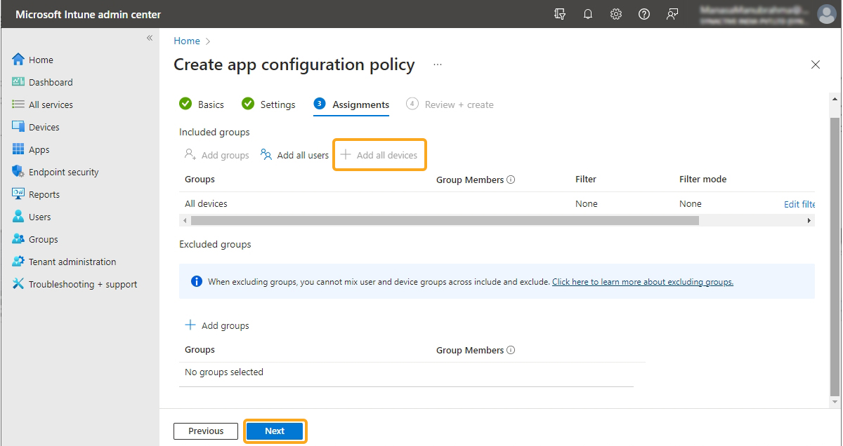 - Under the Assignments section, select Add all devices and proceed to the next step.
