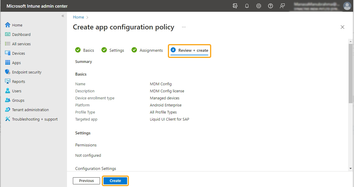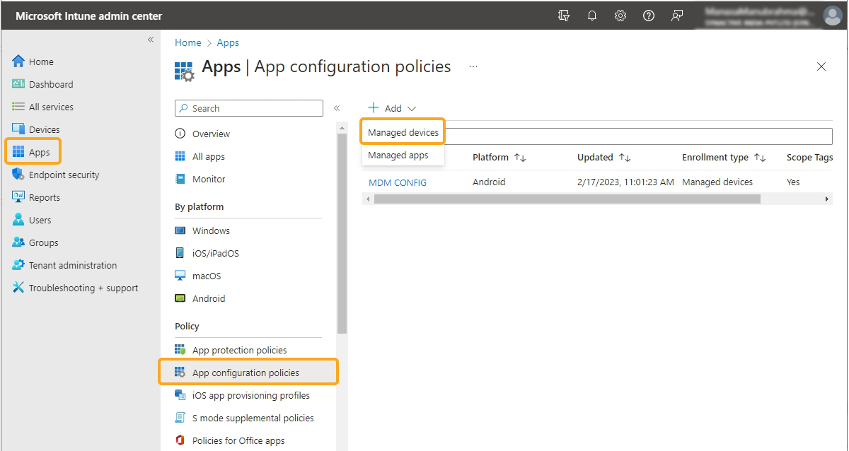 - Go to Apps->App configuration policies. Click on Add and select Managed devices. Then, you will be navigated to the Create app configuration policy page.