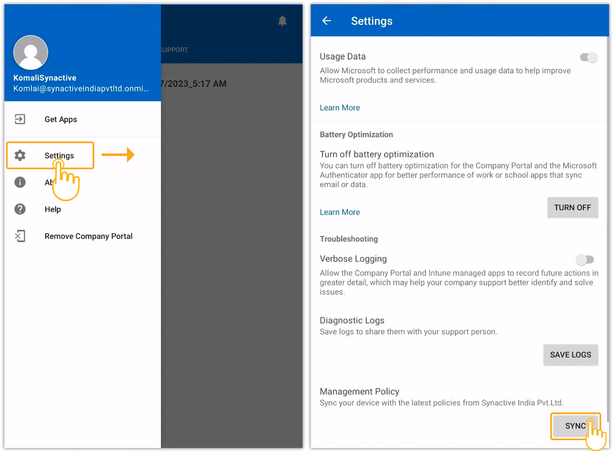 - Usually, the company portal syncs devices automatically with an active internet connection. To sync manually, click on Settings under the menu, select Management Portal, and finally tap SYNC.