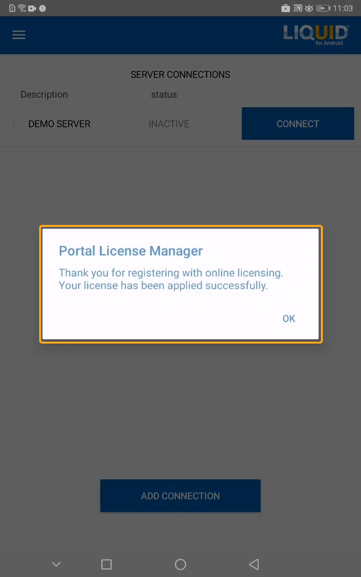 - While navigating within the Liquid UI app, You will see the Portal License Manager popup showing the successful license installation message.