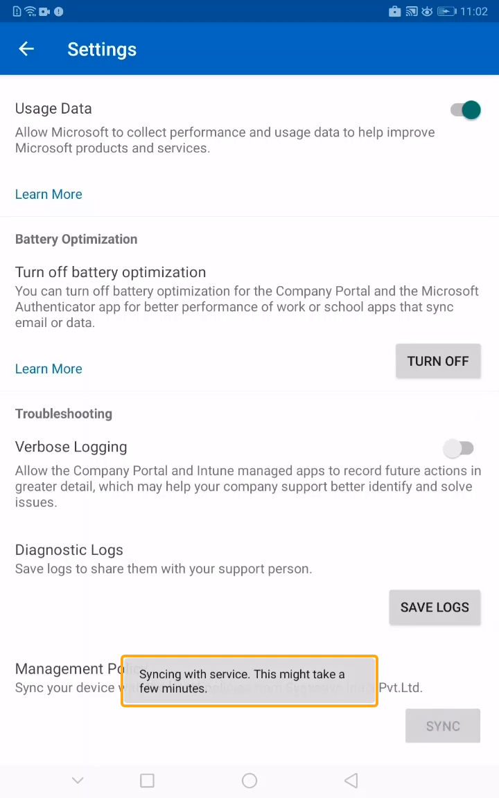 - You can see a message as Syncing with service. This might take a few minutes, while your device sync settings.