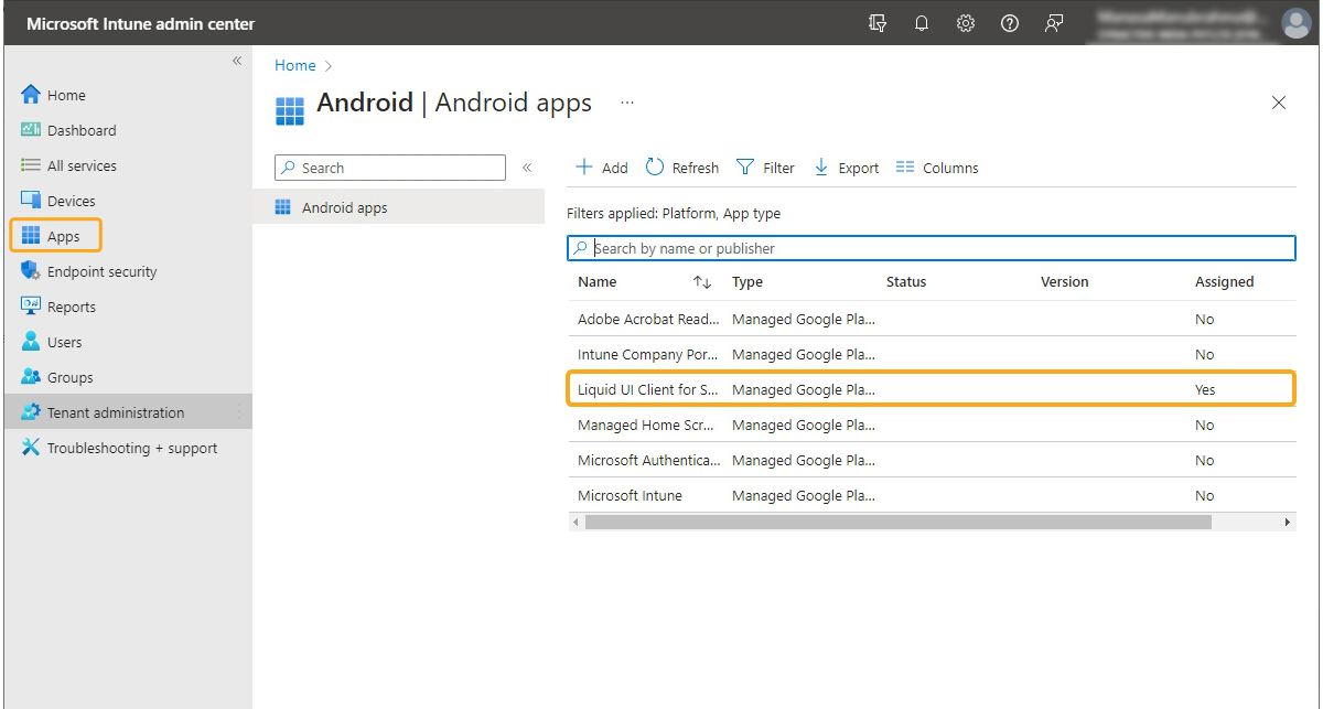 - To check the app status, navigate through Apps->All Apps, and then you can see the status of the Liquid UI app is Yes as assigned, as shown below.