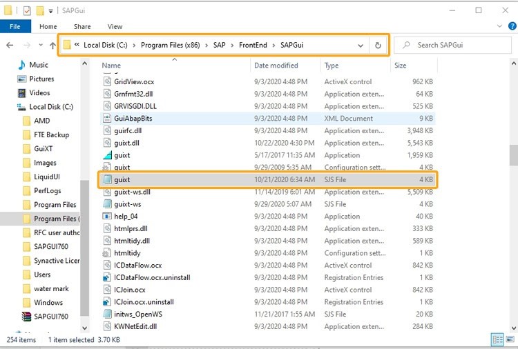 - Locate the guixt.sjs file found in the SAPgui folder on the local machine. Typically, you can find the file at the following location based on the operating system: