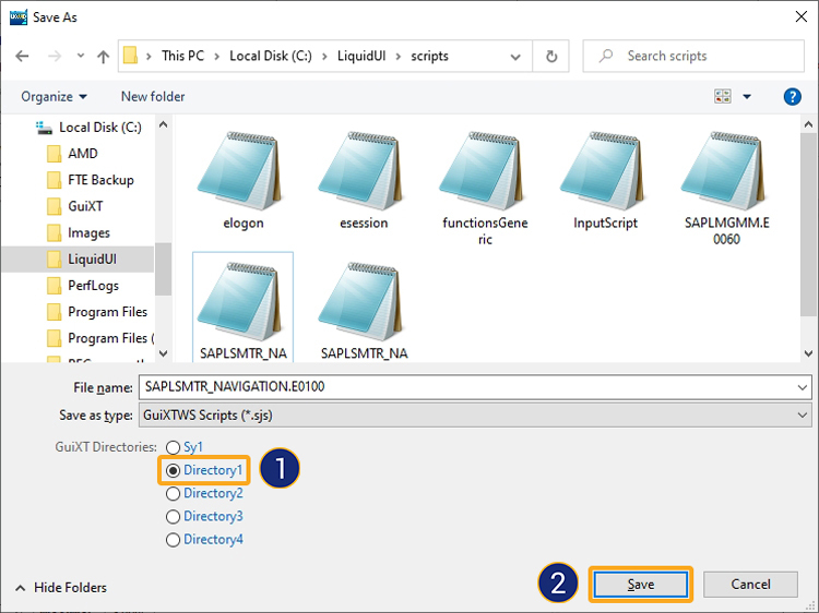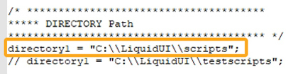 - Now, specify the directory path in which the Liquid UI Script files will get saved. For example: If the Liquid UI Script needs to be stored in the path "C:\\LiquidUI\\scripts"; then specify the path, as shown in the following image: