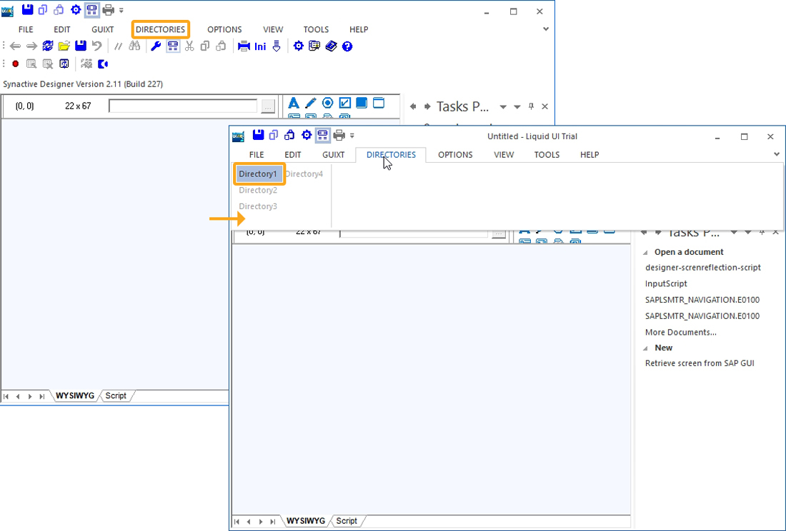 - Now, open the Liquid UI Designer. On the menu bar, click on the DIRECTORIES option and verify whether the directory is set to the relevant path where the Liquid UI scripts are saved.