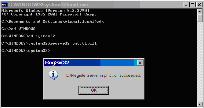 - You are now in the system32 directory. Type regsvr32 pntctl.dll and press Enter.