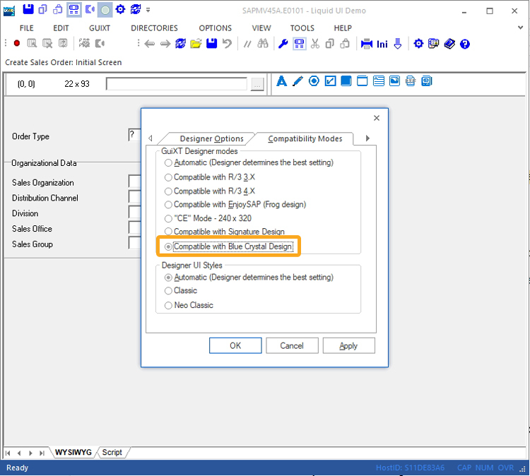 - Under GuiXT Designer modes, select "Compatible with Blue Crystal Design," then click Apply and confirm your selection by clicking OK.