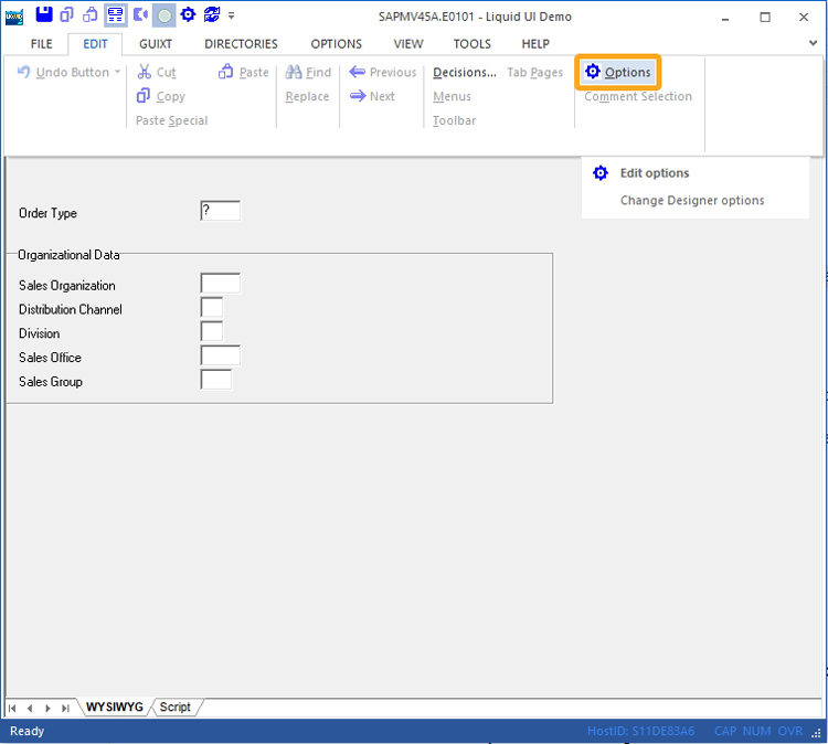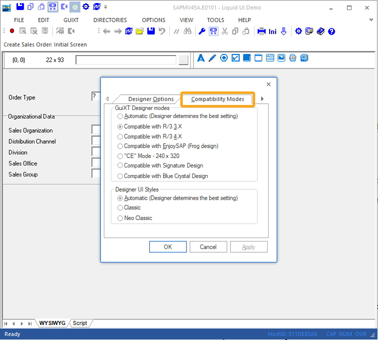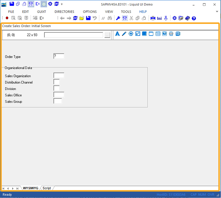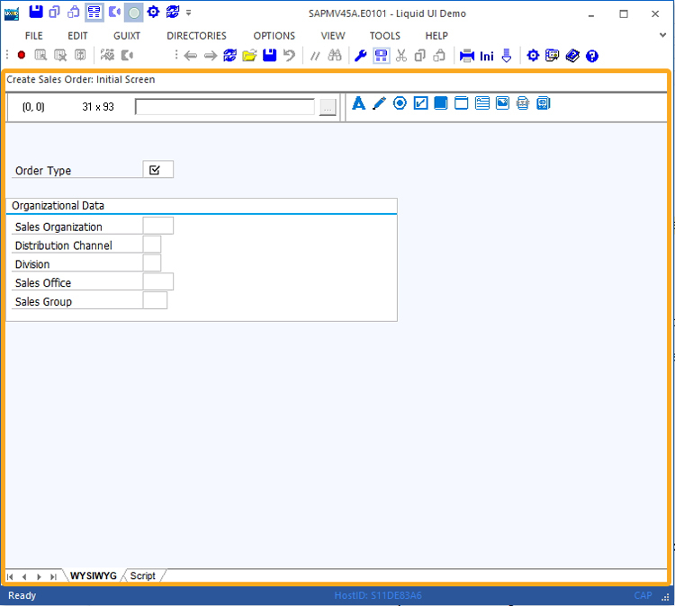 - Launch the Liquid UI Designer on your system. Then, open SAP GUI and navigate to the required transaction screen (here, we navigated to Create Sales Order screen). Now, refresh Designer to view the transaction screen on it, as shown below: