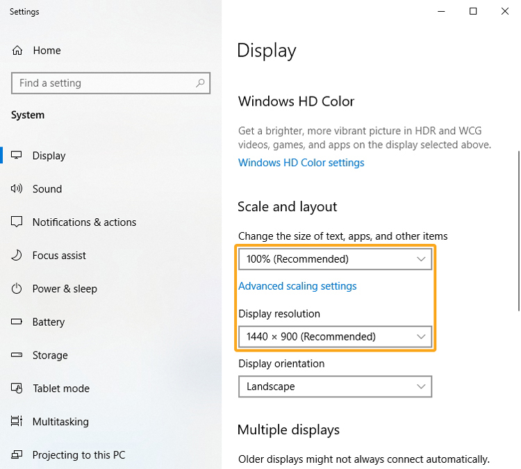 To resolve issues concerning Designer screen resolution, you need to check Display settings in your Windows PC and set them, as shown in the below section.