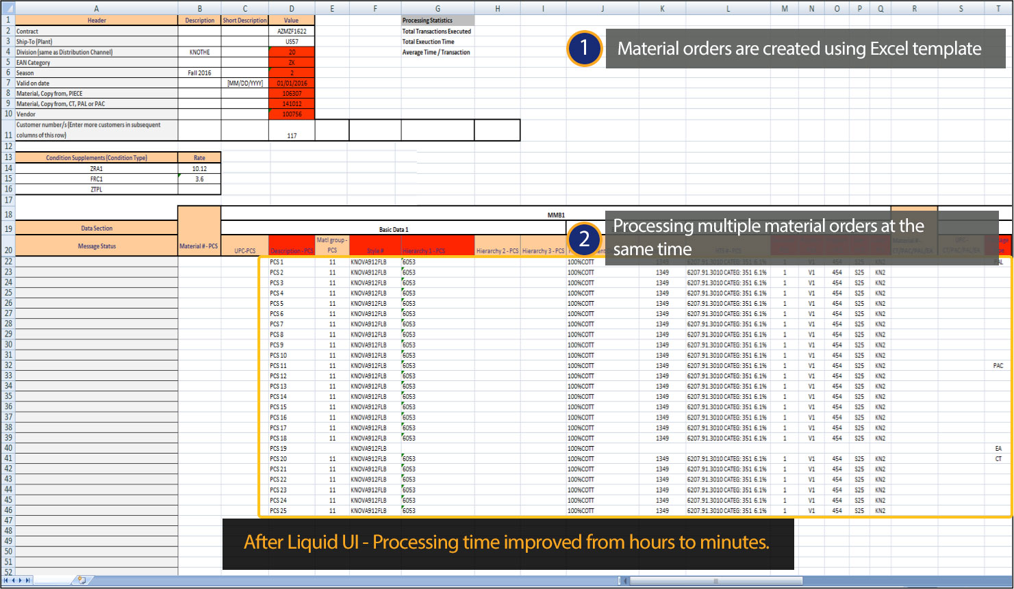 • Liquid UI for Excel simplified and automated their day-to-day material creation activities reducing the processing time from hours to a few minutes.