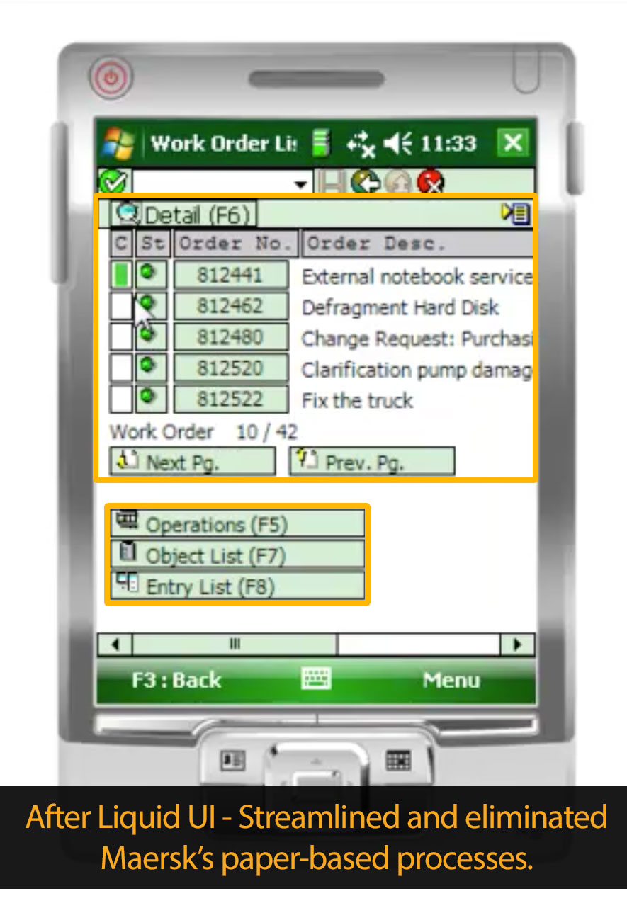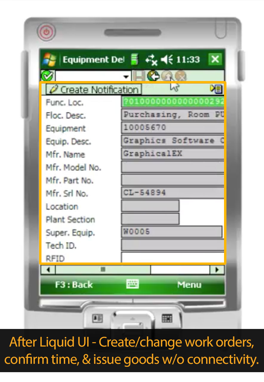 • With Liquid UI, maintenance personnel now have access to SAP from which they can create and change work orders, confirm time, and issue goods.