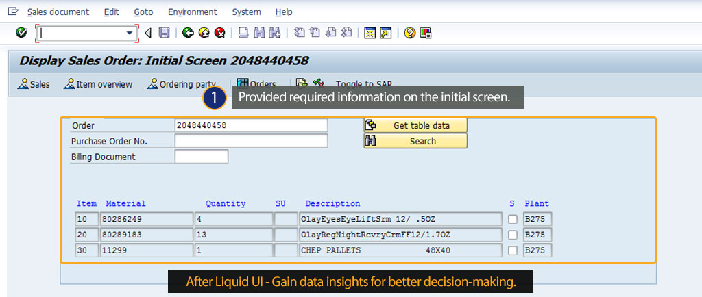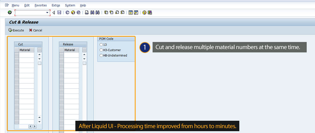 • With Liquid UI, P&G users can cut or release multiple material numbers at a time. Also, they can now copy the material list and sales order list from the email to SAP in a single instance.