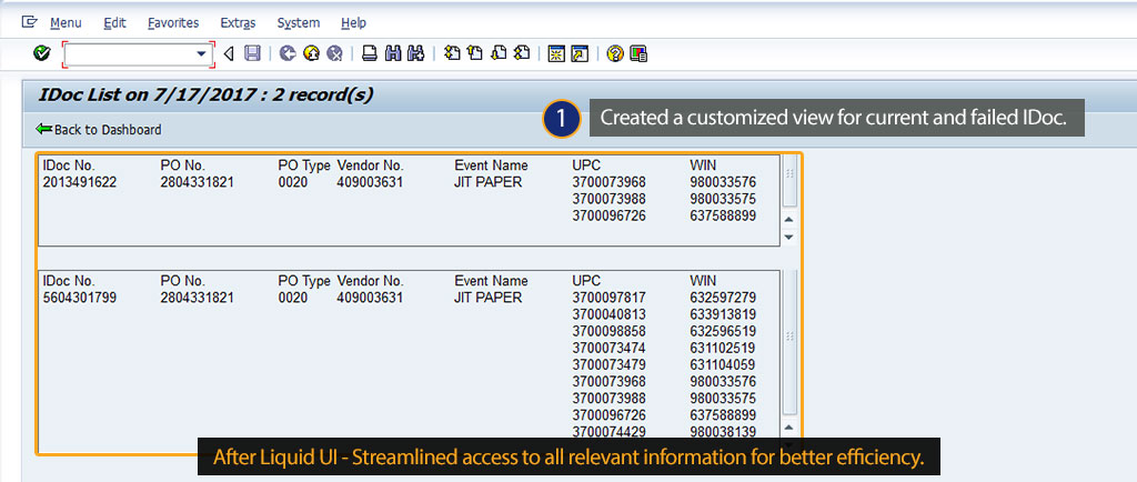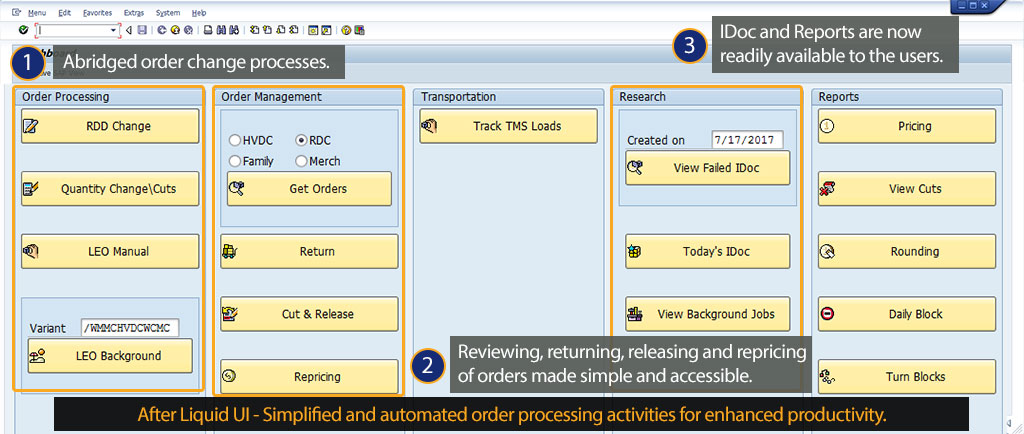 • Liquid UI provided a dashboard view, which saves time as users now do not need to remember different t-codes and corresponding processes.