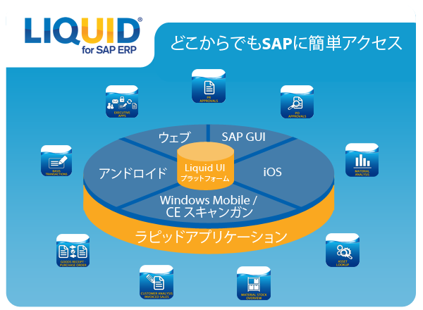 GuiXT WSのテクノロジーに基づいて構築されたLiquid UIプラットフォームは、ブラウザベースのクライアントを必要とせず、SAP ERPのネイティブ接続により、iOS、アンドロイド、Windows CE、HTML5ブラウザ、またはSAP GUIなどのアクセスポイントへの拡張を可能にします。