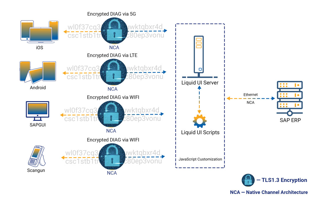 Liquid UI Server is a multi-thread architecture that ensures complete control over data between your client and your SAP. The data is encrypted using TLS1.3, the standard security protocol. It assures traffic leaving the Liquid UI server, and your device is encrypted so no one can intercept and read it. It also supports client certificates.