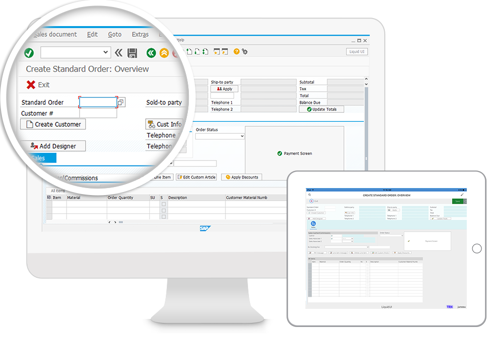 Liquid UIを使用すると、ビジネスプロセスの簡素化、不要項目の削除、画面、タブ、およびトランザクションの統合、またトランザクションの豊富さを維持しながら全体的なソリューションの構築を実現することができます。これにより、トランザクション全体の再構築の必要がなくなります。
