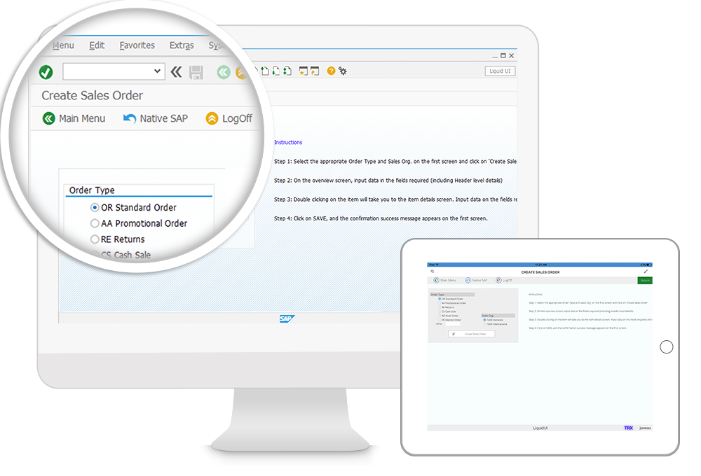 Liquid UIは、複雑なERPプロセス(VA01やMIGOなど)をカスタマイズされ合理化されたエラーのないUXに簡単に変換します。インプレースエディットのポイントアンドクリックワークフローとプロセスツールの使用により、ビジネスにとって重要となるユーザの生産性を向上させます。
